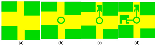 Step-wise design procedure for achieving multiband operation. (a) Ant #1, (b) Ant #2, (c) Ant #3, and (d) Ant #4.