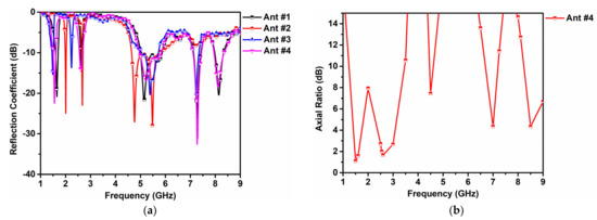 Single element pentaband reflection coefficient of Ants #1 to #4. (a) Reflection coefficient (b) axial ratio.