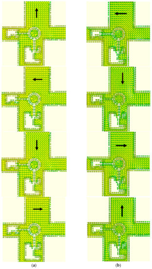 Further, the CP behavior of the proposed antenna is analyzed using the surface current distribution, as shown in Figure 5. The figure shows the CP bands at 1.5 GHz and 2.6 GHz. From the current distribution in Figure 5a, it is observed that the current on the top middle portion of the patch rotates in an anticlockwise direction over time, with different phases of 0°, 90°, 180°, and 270° at 1.5 GHz from left to right, respectively. This rotating current distribution generates a circular polarization in the radiated field. Additionally, the top left portion of the patch also exhibits current distribution in the same direction at 2.5 GHz, indicating that the antenna possesses CP characteristics at this frequency as well.