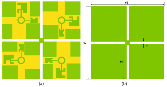 As the demand for wireless communication continues to grow, there has been a significant increase in the development of multiband MIMO antenna concepts for existing wireless systems in recent years [9,10]. However, designing MIMO antennas presents a primary challenge of reducing the coupling between adjacent antenna elements [11]. Reducing the coupling between antenna elements is essential, as it directly impacts the system’s throughput [12]. Therefore, various decoupling strategies have been explored in the literature, including using a slit on the ground plane, neutralization lines, parasitic structures, frequency-selective surfaces, and artificial metamaterials.