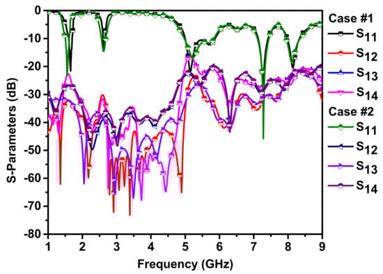 To assess the performance of the quad-port antenna, simulations were conducted by exciting one port and applying matched loads to the other ports. The scattering parameters were nearly identical across all antenna elements and similar to those of the single-element response. The S-parameter characteristics with and without a ground slit are depicted in Figure 7. In Figure 7, the S12 parameter measures the power transmitted from one port of the antenna to another, and it should be typically less than −20 dB for effective isolation between the ports. Case #1 represents the MIMO antenna with a full ground plane, while Case #2 features a slotted ground plane. The introduction of a ground slit did not affect the reflection behavior, as observed from S11. However, the mutual coupling between ports 1 and 4 in Case #1 at 5.15 GHz was less than 15 dB. By adding a half-wavelength ground slit, the coupling was reduced by over 8 dB from Case #1. Based on analyzing the specific resonance characteristics of the quad-port pentaband MIMO antenna, the 5 distinct frequency bands, as listed at 1.55 GHz (1.5–1.65 GHz), 2.5 GHz (2.4–2.7 GHz), 5.2 GHz (5–5.85 GHz), 7.3 GHz (7.1–7.4 GHz), and 8.15 GHz (7.9–8.4 GHz), achieve their respective mutual coupling reductions at around 27 dB, 37 dB, 21 dB, 29 dB, and 21 dB, respectively. The isolation between the antenna elements was also greater than 20 dB in all resonance bands, indicating good performance. The antenna’s overall dimensions for the quad-element design measured 62 × 62 mm2, and the orientation of the elements ensured they remained well separated without a large gap between them.