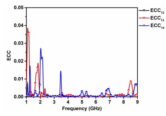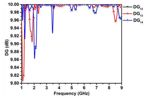 The is a correlation between antenna elements, which is denoted by , which refers to the ith port of the radiation pattern, and the Hermitian product symbol is a dot (•). A desirable value for ECC is less than 0.5. As illustrated in Figure 8, the calculated 4-port antenna’s ECC values for all port combinations in the designated band are less than 0.05 in all resonating bands. This low-value criterion is necessary to ensure that the signal-to-noise ratio remains unaffected in a diversity scenario. This situation is also associated with the investigation of another parameter known as DG, which identifies signals traveling over multiple paths and originating from the same transmitter.