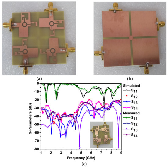 Fabricated prototype and S-parameter validation comparison. (a) Top, (b) bottom, and (c) simulated and measured S-parameter comparison.