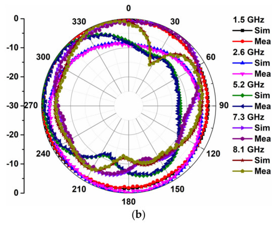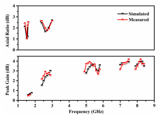 The 3 dB ARBW and peak gain were also evaluated, and the simulation and measurement results are shown in Figure 11. At 1.55 GHz and 2.6 GHz, the simulated axial ratios are 1.05 and 1.65, respectively, and the measured axial ratio is in good agreement with the simulation results. Moreover, the peak gain values for the 5 resonance frequency bands are 0.55 dBi, 2.5 dBi, 3.65 dBi, 3.85 dBi, and 3.9 dBi, respectively. Furthermore, the measured gain is relatively similar to the simulated gain.