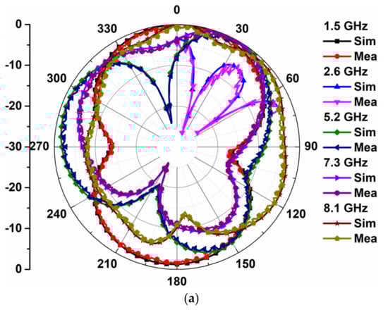 The directional properties of the MIMO antenna proposed in this paper were evaluated by measuring and simulating its radiation patterns at various frequencies. The results, as shown in Figure 12, demonstrate that the antenna exhibits bidirectional and omnidirectional patterns in both the E-plane and H-plane at lower frequencies. At higher frequencies, the E-plane pattern displays a main lobe in the +z direction, while the H-plane deviates slightly from +z and has a null at 30°. At 2.6 GHz, both the E-plane and H-plane patterns are in the -z-direction. For the other 2 frequencies, there are deviations from the +z direction, and a sharp null is observed between 0° and 30°. Overall, the directional properties of the antenna make it suitable for use in a variety of wireless applications that require reliable and consistent signal transmission and reception across multiple frequency bands.