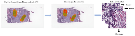 Referring to patch-level annotations as strong means that all extracted patches have their own label class. Typically, patch labels are derived from pixel-level annotations. Manually annotating pixels is very time-consuming and laborious work requiring an expert approach. For instance, pathologists have to localize and annotate all pixels or cells in WSI by contouring the whole tumor. This approach is shown in Figure 2. Therefore, there are currently very few strongly annotated histological images. Besides whole-slide image classification, pixel-wise/patch-wise predictions with the sliding window method enable spatial predictions such as localization and detection of cancerous cells/tissue. In addition, stacking patch predictions next to each other builds a WSI heatmap, so the model can be considered interpretable. Multiple examples of using CNNs in the problem of patch classification employ a single-stage approach when the patch is classified using one CNN architecture. In contrast, several approaches use a multi-stage workflow, where typically the output of one CNN architecture is fed into another CNN that delivers the final decision. Of course, even more CNN models can be included in such a workflow that can be labeled as multi-stage classification. For the one-stage approach, one can differentiate between models that have been trained from scratch with artificially initiated weights and models that use pre-trained CNN architectures on data often not related to the original problem. For multi-stage problems, such differentiation becomes difficult due to many possibilities, since some CNNs from the multi-stage workflow may be trained from scratch, while others may be pre-trained. In Figure 3, the top graphic shows the categorization of CNN methods used in this section.