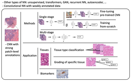 The rest of this paper is organized as follows. In Section 2, a basic overview of neural networks used in the context of computational histopathology is presented. Section 3 discusses in detail supervised deep learning models and approaches used in digital pathology for classification tasks. These approaches have been grouped into three main categories: one-stage classification using fine-tuning, one-stage classification training models from scratch, and the multi-stage classification approach. In Section 4, we discuss the histopathological point of view by classifying the methods according to their area of application. In Section 5, we conclude the paper.