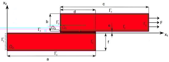Consider an area consisting of three sub-areas (Figure 1), which are interconnected. One of the sub-areas is the solder layer. We denote the Young’s modulus of elasticity in the subdomains , respectively. The two-dimensional elastic region is bounded by a closed surface , and it is assumed that the material is isotropic and linearly elastic.