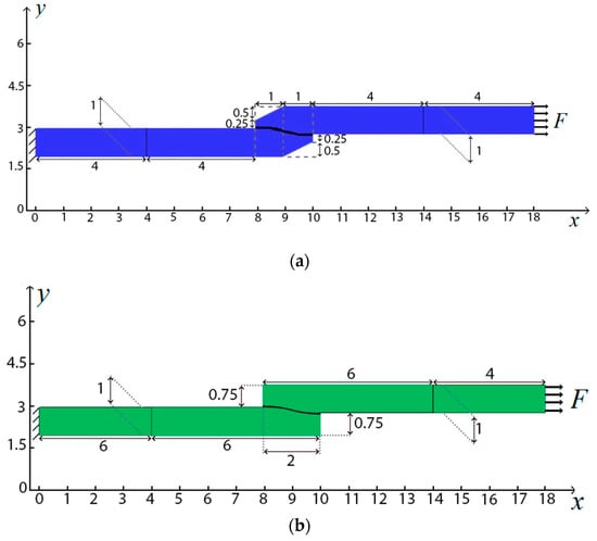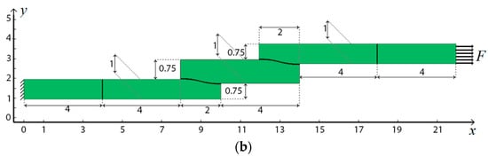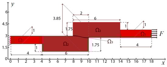 Consider a three-layer elastic structure, the dimensions and boundary conditions for which are given in Figure 6. Region is filled with duralumin with Young’s modulus equal to , is the area of the topological optimization problem. It requires the optimal microstructure of the distribution of a given amount of duralumin, is the area of evenly distributed silver solder with . Mechanical load acting on the right , the left border is fixed.