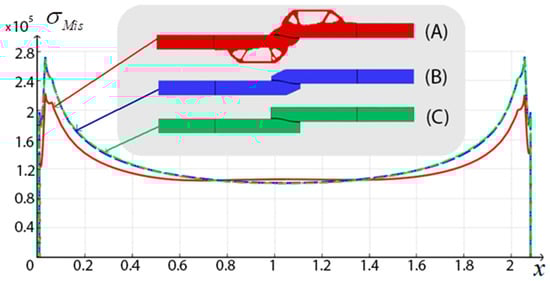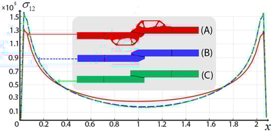 The results of topological optimization are shown in Figure 4 and Figure 5, which display the distributions of shear stress and Mises stress , respectively, in the adhesive layer for the A, B, and C design cases. It should be noted that all plots for and hereafter are given for the line passing through the center of the adhesive layer.