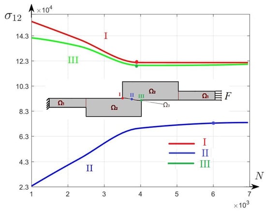 Dependence of shear stresses at points I, II, III of the number of FEs of problem 2.