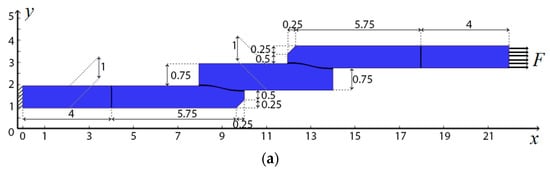 where is the modulus of elasticity of the material in the finite element, —modulus of elasticity of the base (originally specified) material, —a penalty parameter, and increasing it leads to a better solution to the optimization problem. The p-value was chosen to be either 4 or 5, according to the recommendations given in Bendsøe [34]. The design variable is bounded from below by a constant , introduced to prevent degeneracy of the finite element matrix.