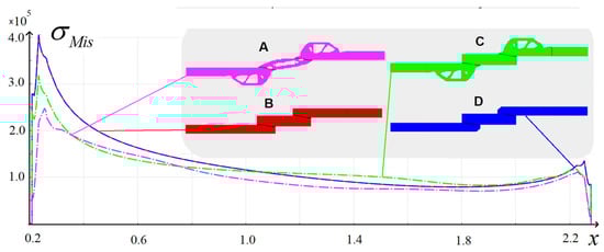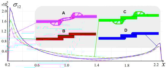 Figure 8 and Figure 9 show the distribution of shear stress and Mises stress , respectively, in the adhesive layer that connects the middle and upper parts of the structure for cases A, B, C, and D. Qualitatively similar results were obtained for the adhesive layer that connects the lower and middle structures. The graphs depict the stress distribution along the lines that pass through the center of the adhesive layer.