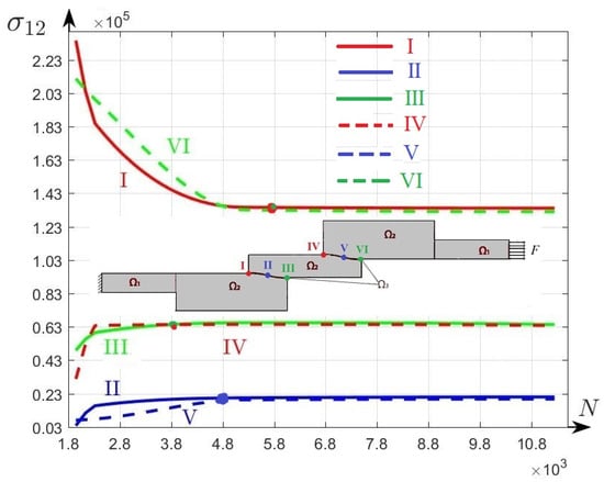 In the study, similarly to problem 1, the influence of the number of FEs on the results of solving the optimization problem was investigated in order to justify the validity of the obtained results. The results are given in Table 4 and Figure 10. For maximum shear stress , the difference between result values with the number of FEs and is 0.2%, which confirms the reliability of optimization results. The results shown in Figure 10 show that the stress convergence at the midpoints of the solder solution occurs with number FEs equal to . The stress at the extreme points I and VI is also stabilized with a number of FEs equal to , and at the points (II, IV) the solution is stabilized with a number of FEs equal to . Thus, as in Problem 1, the shear stresses at the solder endpoints (I, III, IV, and VI), both top and bottom, converge faster than for the central points (II,V). The difference from problem 1 is in the other character of stress “equalization”—this process proceeds in pairs. Stresses at the extreme points (I-IV), (III–IV), and at the central points (II–V) are equalized.