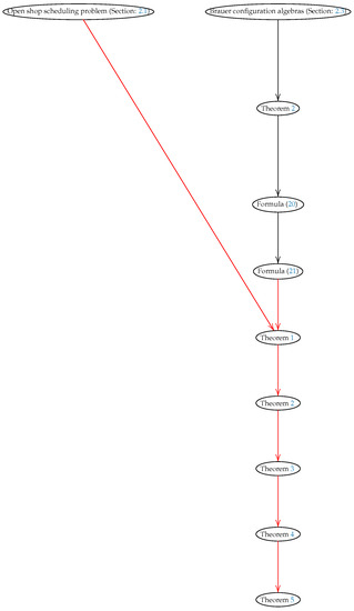 There is currently great interest in researching the OSSP due to its new applications in various fields. Applications of this problem can be found in transport, healthcare, satellite communications, sports, and elsewhere [1,2,3,4]. However, few publications exist that connect investigations of the OSSP with investigations in algebra. ARguably one of the more remarkable works on these types of connections uses max-plus algebra or Tautenhahn’s approach [11], which employs Latin rectangles to solve the OSSP. It is worth noting that there are no works in the literature devoted to the interactions between the theory of representation of algebras and OSSP research. In particularly, more studies are needed on the relationships between Brauer configuration algebras and job shop scheduling problems in general.