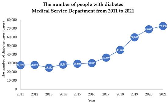 Based on hospital statistics collected by the Medical Service Department of Bangkok, Thailand, the number of diabetes cases in government hospitals in Bangkok continuously increased from 27,927 (8.81% of total hospital cases) in 2011 to 72,958 (68.07% of total cases) in 2021, as shown in Figure 1. In addition, a Thailand health survey report conducted by the Heath Systems Research Institute (HSRI) in 2019/2020 revealed that 30.6% of people with diabetes did not know they had it, and 13.9% were undiagnosed.