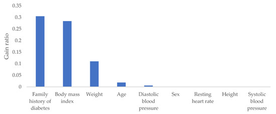 According to a relevant research study, classification models with interaction terms are shown to be more efficient than the models without interaction terms [12]. Based on the results from the gain ratio method, it was found that family history of diabetes and body mass index were the most important to predict diabetes, as shown in Figure 3. Therefore, in this study, we included the interactions of these two most important risk factors affecting diabetes and the other factors into the models as shown in Table 4 and Table 5.