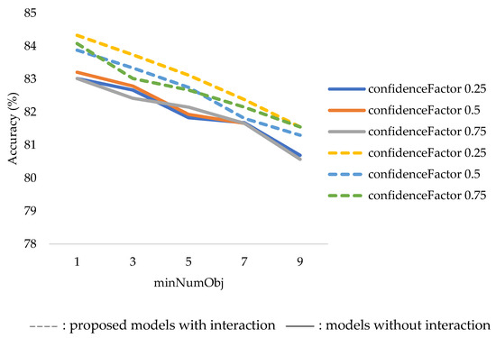Based on the result of five-fold cross-validation of the models without interaction, the hyperparameters that yielded the highest accuracy were confidenceFactor = 0.5 and minNumObj = 1, which provided an accuracy of 83.02%. Regarding the proposed models with interaction, the values were confidenceFactor = 0.25 and minNumObj = 1, which provided an accuracy of 84.08%, as shown in Figure 5.