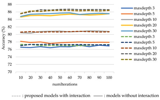 Based on the results of the five-fold cross-validation of the models without interaction, the hyperparameters that yielded the highest accuracy were numIterations = 60 and maxDepth = 30, which provided an accuracy of 85.76%. Regarding the proposed models with interaction, the values were numIterations = 60 and maxDepth = 20, which provided an accuracy of 86.72%, as shown in Figure 6.