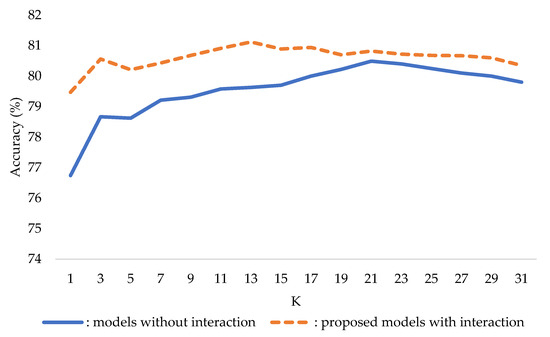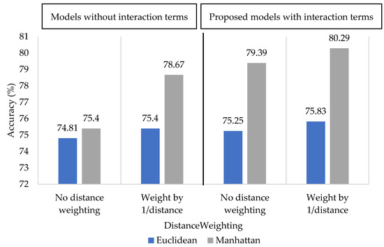 Based on the five-fold cross-validation results of the models without interaction terms, the hyperparameters that yielded the highest accuracy were distanceFunction = Manhattan, DistanceWeighting = Weight by 1/distance, and K = 21, which provided an accuracy of 80.49%. Regarding the proposed models with interaction terms, the values were distanceFunction = Manhattan, DistanceWeighting = Weight by 1/distance, and K = 13, which provided an accuracy of 81.12%, as shown in Figure 9.