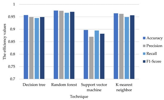 In order to determine the hyperparameters for all machine learning techniques, we applied a grid search technique and five-fold cross-validation to the training dataset and compared the classification results based on accuracy, precision, recall, and the F1-score.