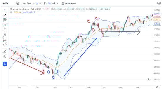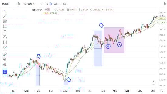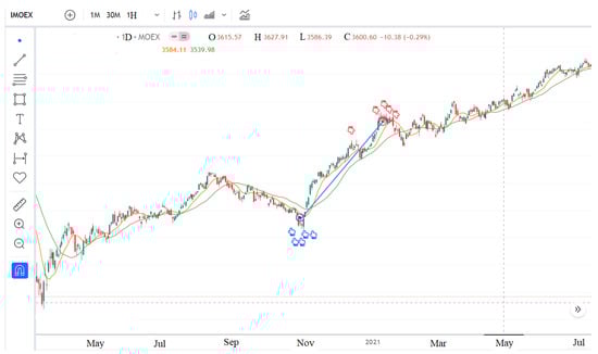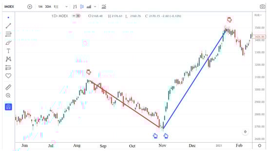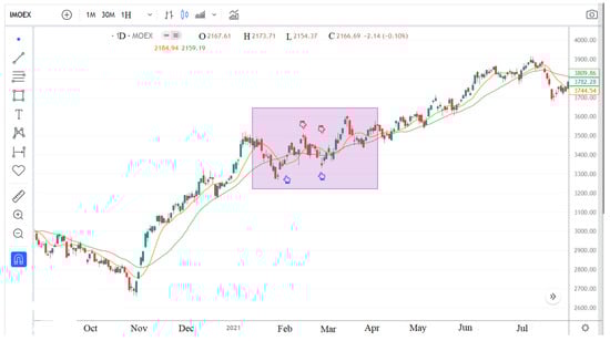 Figure 2 shows the IMOEX chart for the period July 2020–February 2021. This is the “Japanese candlestick” chart, the most common among traders at the moment because it gives in a compressed form the most complete picture of the dynamics of the exchange price from a given discretization. The chart consists of rectangles with tails, or the body of the candle and its shadows. Each individual element is the fluctuations of quotes for a certain period of time, which is called a timeframe. On this chart, the timeframe is 1 day. The end point of the upper tail is the high price for 1 day, the lower tail is the low price for this day, the red candlestick represents that the closing price of the day was below the opening price, the green one represents that the closing price of the day was above the opening price, and the closing and opening prices are the borders of the rectangle. It is very similar to the speckled box-and-whisker chart from the standard set of charts in Excel. Regarding the parameters of each candle, the following terms are used hereafter on these charts: open (O)—the opening price; close (C)—closing price; low (L)—minimum value; high (H)—maximum value.