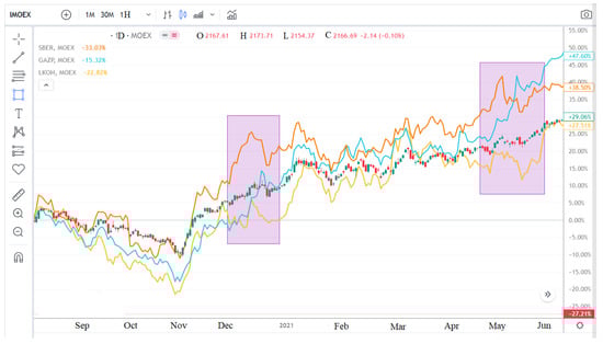 To calculate the Moscow Exchange Index, IMOEX, 40 securities were used. The securities with the largest weight were GAZP (14.28%), LKOH (12.72%), and SBER (13.16%), according to the data from www.moex.com as of 20 January 2023. As can be clearly seen in Figure 4, there is a significant correlation between the securities included in the index (orange line—SBER, turquoise—GAZP, yellow—LKOH) and the index itself. This is especially evident in time series with a period of 1 day or more. This is explained by the peculiarities of the securities included in the index and by the fact that during the day, the key news affecting the market already has time to be considered, and its price may already vary. However, even despite this, the chart shows that the key trend reversals for individual securities and the index occurred at different points in time. For example, in Figure 4, these areas are highlighted with pink rectangles. On the candlestick chart in the period of 1 h, the situation would be brighter.