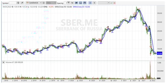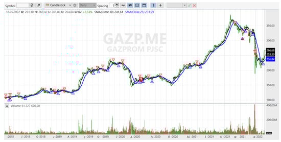 One moving average is “short” with a period of n, and the other moving average is “long” with a period of m > n. Further, in the following examples, n = 10 and m = 25. Crossing the “short” moving average “long” from the bottom up is a signal to open a long position and close a short position, and from top to bottom, it indicates one should close a long position and open a short position.