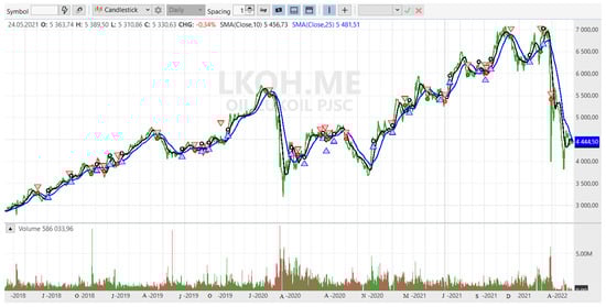 Trading Signals for Stocks of LKOH. Black line—MA (10), blue line—MA (25).