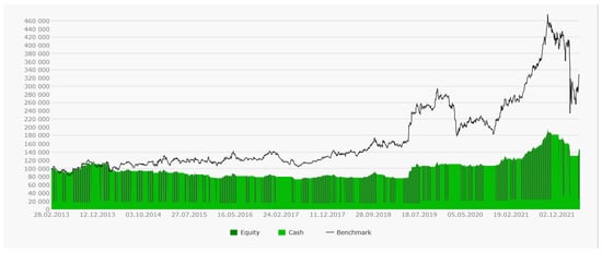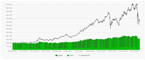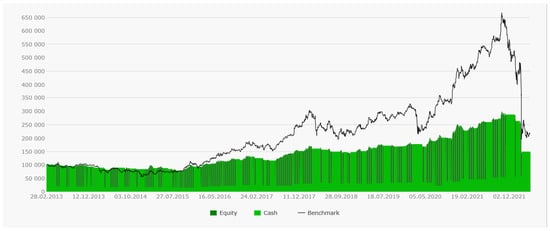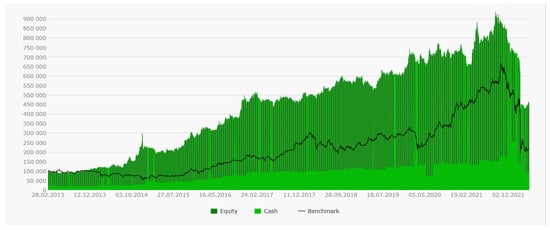 As mentioned previously, around the optimal entry points to the position, trading signals appeared, which were obtained because of the analysis of each of the rows. Figure 13 clearly shows the downtrend, uptrend, and lateral trend identified by the strategy. Setting up a position in equal shares of 33% on the blue marks provided an ideal diligent entry point into the position, exactly like closing a position in equal shares on the red marks.