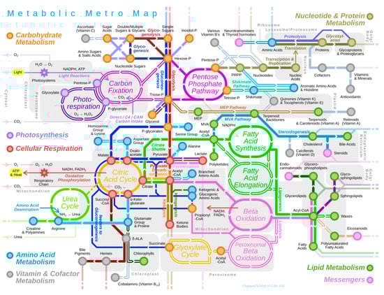 Metabolic ‘Metro’ map (From Chakazul, 2016. Wikipedia, “https://en.wikipedia.org/wiki/File:Metabolic_Metro_Map.svg (accessed on 27 May 2023)”).
