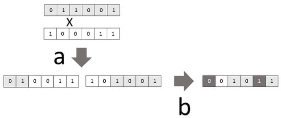 Mutation was simulated (Figure 4b) by randomly choosing one of the offspring chromosomes, e.g., the right one. Next, we randomly selected two positions, for example, the first and the fifth, flipping the value of the binary number (0 → 1, 1 → 0). In a manner similar to recombination, the population mutation rate pm is set at the beginning of the simulation experiment.