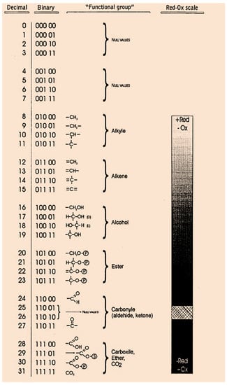 In 1974, ref. [17] translated the molecular topology into a matrix, taking an element aij with the value of 1 when the edges are adjacent or 0 otherwise. However, unlike this procedure, the method we have followed in this work assigns a 5-bit word to the functional groups of the molecule. To this end, we defined a table or “Rosetta stone” of cellular metabolism. According to Figure 5, we assigned a 5-bit word to each functional group (group of atoms in a molecule with distinctive chemical properties), ordering the most frequent functional groups in the metabolic intermediates depending on their redox potential (the tendency of a functional group to acquire electrons). Note how the vectors were classified by their redox potential from the most reduced form corresponding to the alkyl group to the most oxidized form represented by CO2.