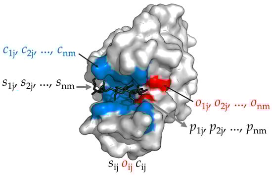 Organization of the active center of an enzyme. The conformational state of the substrate binding site (blue) is modeled with the sequence c1j, c2j,…, cnm while the catalytic site (red) is represented by o1j, o2j,…, onm. The substrate s1j, s2j,…, snm is the black colored molecule that will be transformed into a product p1j, p2j,…, pnm by the sij oij cij rule (The figure corresponds to lysozyme and the substrate is peptidoglycan. Modified from Thomas Shafee, 2015. https://commons.wikimedia.org/wiki/File:Enzyme_structure.svg).