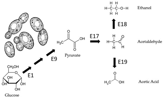 Biochemical model of alcohol fermentation in yeast. In the metabolic pathway of glycolysis, glucose is transformed by the action of successive enzymes (E1 … E9) into pyruvic acid. Fermentation begins with a first biochemical reaction catalyzed by the enzyme E17, in which pyruvate is transformed into acetaldehyde. The acetaldehyde is then transformed into ethanol through the reaction catalyzed by the E18 enzyme, or alternatively, the acetaldehyde is converted into acetic acid by the E19 enzyme. In the present simulation, we have not considered for simplicity that the reaction between acetaldehyde and ethanol is reversible.