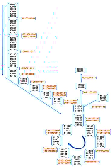 Figure 10 represents in a graph and using binary notation the flow of information in bits that would take place in a ‘digital electronic circuit’ that would be the hardware implementation of the central carbon metabolism, i.e., glycolysis and Krebs cycle. In Figure 11, we illustrate the classical performance graph of a genetic algorithm, thereby proving at the simulation level the Darwinian evolutionary convergence of enzymes in a hypothetical organism. Table A2 and Table A3 (Appendix B) show the results obtained in the simulation of glycolysis and Krebs cycle, respectively.