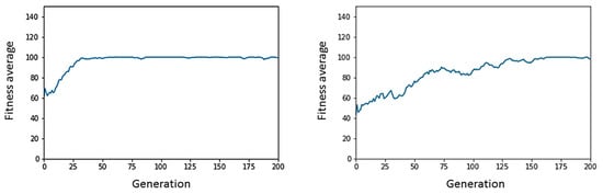 In the above function (8), indexes i, k represent the rows and j the column in the matrix S, is a coefficient whose value was 100 in the simulation experiments, is equal to the term, and l is the chromosome length. Thus, the enzyme fitness value is calculated by simulating the enzyme–substrate reaction (4), i.e., the operation between substrate and enzyme (7), and then comparing the product obtained from the reaction with the target product , i.e., the substrate of the next step or reaction of the metabolic pathway. The similarity between the obtained product and the target product or next substrate was calculated using the Hamming distance . The Hamming distance is the number of positions in which two binary vectors or matrices with identical length or number of rows and columns differ, respectively. For this purpose, the chromosomes were decoded, resulting in the configuration of each enzyme, i.e., the conformational state (c1j, c2j,…, cnj) and the catalytic site (o1j, o2j,…, onj) involved in the reaction.