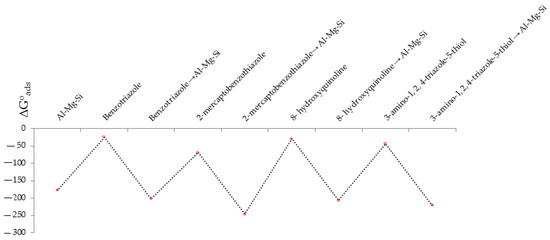 Based on Figure 8, we assumed that for benzotriazole → Al-Mg-Si, 2-mercaptobenzothiazole → Al-Mg-Si, 8-hydroxyquinoline → Al-Mg-Si, and 3-amino-1,2,4-triazole-5-thiol → Al-Mg-Si, the Lennard-Jones potential as an intermolecular pair potential can be described [60,61].