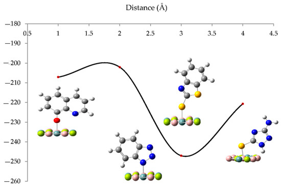 Then, the distance between the nitrogen atom in benzotriazole, oxygen atom in 8-hydroxyquinoline, and sulfur atom in both 2-mercaptobenzothiazole and 3-amino-1,2,4-triazole-5-thiol with aluminum on the Al-Mg-Si nanosurface was evaluated (Table 5 and Figure 8).