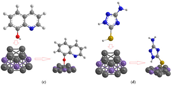 Finally, “TD-DFT/6-31+G (2d,p)/EPR-III/LANL2DZ” computation which has been a computational QM modelling methodology for studying the electronic structure of many-body systems [49,68,69,70,71,72], was done to identify the low-lying excited states of benzotriazole, 8-hydroxyquinoline, 2-mercaptobenzothiazole, and 3-amino-1,2,4-triazole-5-thiol adsorbing on the Al-Mg-Si alloy surface. The data contained the vertical excitation energies, oscillator strengths, and wavelengths, which are shown in Figure 9a–d.