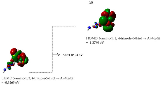 Ionization causes the highest occupied molecular orbital (“HOMO”) energy, and the electron affinity produces the lowest unoccupied molecular orbital (“LUMO”) energy, which were calculated and reported for benzotriazole → Al-Mg-Si, 2-mercaptobenzothiazole → Al-Mg-Si, 8-hydroxyquinoline → Al-Mg-Si, and 3-amino-1,2,4-triazole-5-thiol → Al-Mg-Si (Scheme 3). The “HOMO” (au), “LUMO” (au), and band energy gap “∆E = E LUMO- EHOMO” (ev) present a pictorial explanation of the frontier molecular orbitals and their respective positive and negative zones, which were important factors in identifying the molecular characteristics of effective compounds in these organic inhibitors (Scheme 3).