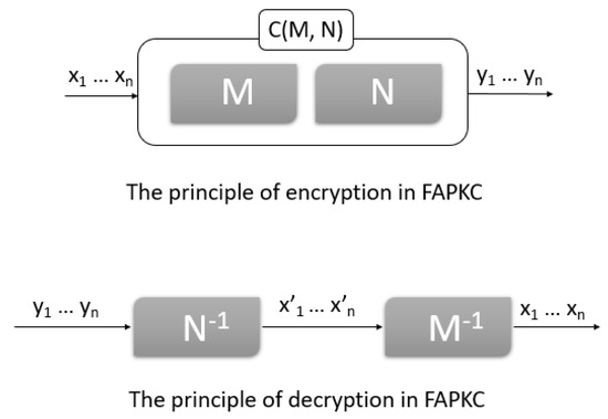 The private keys in FAPKCs are represented by two FSMs with memory, as shown in Figure 1. One is linear and the second is quasilinear [4]. These FSMs are combined using a special product in order to generate a nonlinear FSM, which is the public key. Currently, there is no known algorithm to invert nonlinear FSMs or factorize them, which remains an open problem. To invert the FSM public key, it is necessary to compute the inverses of its factors, a task made straightforward using the private key FSMs. Variants of FAPKCs exist, which differ in terms of the types of FSMs employed in private keys [5].