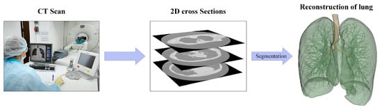 The utilization of multiscale modeling as a novel approach in drug development offers a significant cost reduction in experimental studies. It enables the creation of a digital replica of a drug and facilitates the modeling of its structure and dissolution process in various environments, including the nasal cavity or lungs. Additionally, modern visualization methods for medical data, such as computed tomography (CT)—Figure 1 [9,10], allow for the precise digital representation of anatomical models of the nasal cavity or lungs. This, in turn, enables the accurate prediction of the flight path and deposition sites of drug particles during the developmental stage. Consequently, it provides the opportunity to optimize the composition of a medication to achieve the desired therapeutic effect, even prior to the commencement of clinical trials.