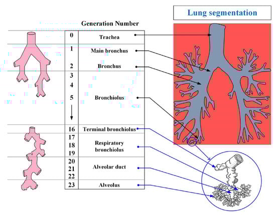 The respiratory system is divided into 23 segments (orders) from the trachea to the alveoli as shown in Figure 2. The upper respiratory tract includes the nasal cavity, the oral and nasal parts of the pharynx, and the larynx; the lower tract includes the trachea and bronchi (bronchial tree). Separately, it is worth highlighting the epiglottis, the function of which is to close the lumen of the larynx when swallowing.
