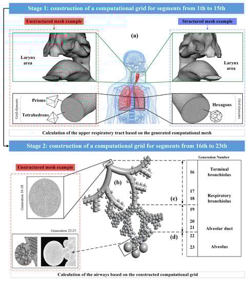 Modern methods of medical data visualization make it possible to build anatomically-similar models of the respiratory system and use them for in silico studies to predict the movement and deposition of particles or drops of drugs using computational fluid dynamics methods; however, at the moment there is a limited number of publications on the study of the movement of drugs in all areas of the respiratory system simultaneously due to the complexity of describing the nature of the air flow. It is noted in [10,21,22] that the reconstruction of a complete 3D model of the entire lung is currently not feasible due to the difficulty of segmenting the small airways using CT images; however, if the entire lung were fully segmented, it would be computationally-impossible to accurately model a complete tree of lungs, since this would require billions of mesh elements. Therefore, modeling of the particle flow through the lungs is carried out separately for the upper and for the lower respiratory tracts, as shown in Figure 3 (Stages 1 and 2).