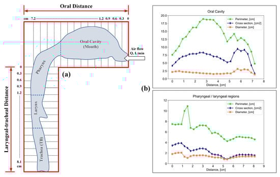 To study the effect of flow velocity on particle deposition zones, the authors of [52] used casts of the human upper respiratory tract with a subsequent digitization of the periphery of the airway contour (Figure 4a). The authors of [52] measured the cross-sectional area and perimeter of the oral cavity, pharynx, and larynx by cutting the cast into 0.3 cm sections (Figure 4b).