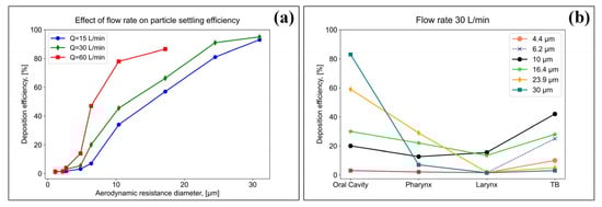 Using an airway model, the authors of [53] studied the effect of various flow rates, namely, 15, 30 and 60 L/min, on the deposition efficiency of particles of various sizes in the respiratory system. The results of the studies of the authors of [53] are presented in Figure 5a,b.