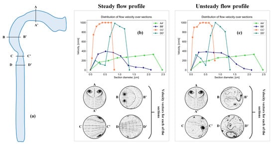Sections in a simplified model of the oral cavity and larynx (a), sections with a steady flow profile (b), and sections with an unsteady flow profile (c).