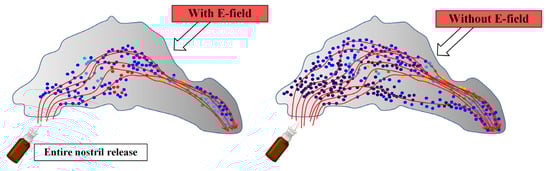 The authors of [67], using the method of computational fluid dynamics in an anatomically-accurate model of the nose, studied the efficiency of delivering a group of charged aerosols to the osteomeatal complex (OMC) when exposed to an electric field. The work considered both monodisperse and polydisperse aerosol profiles. Figure 9 schematically shows the effect of the electric field on the deposition zones of drug particles during the intranasal route of administration [67].