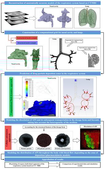 However, in the currently available scientific articles and literature reviews, there is no approach that combines the aforementioned methods of mathematical modeling. According to the authors, the development of a multiscale model that encompasses a unified set of mathematical modeling methods and incorporates sequential stages for predicting the trajectory and deposition sites of drug particles, as well as calculating the release kinetics of drugs from the dosage form and determining a drug’s distribution throughout the body via blood flow, is a pressing task in the development of new drugs for the treatment of socially significant diseases.